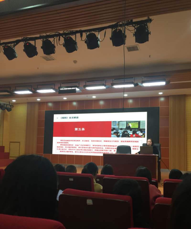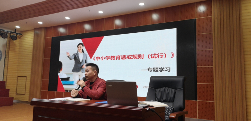 专题学习由小学部主任廖立志主持,由教务处主任袁园主讲。袁主任从教育惩戒的属性、适用范围以及实施的规则、程序、措施、要求等几大方面对《规则》进行了全面解读。廖主任进行总结,他强调,所有教职员工会后要深入学习、吃透《规则》的精髓要义,在教学工作中遇到必须惩戒的教育情境时,一定要有尺度、有力度、更要有温度,要以“以知识与关爱引导人生”的校训为育人目标,做一个手握戒尺,心中有爱的“人师”。