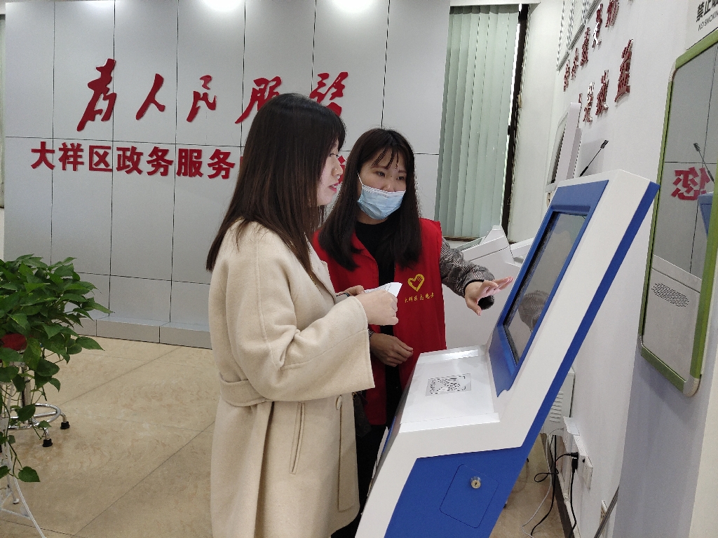 (图为志愿者引导办事群众使用排队取号机)