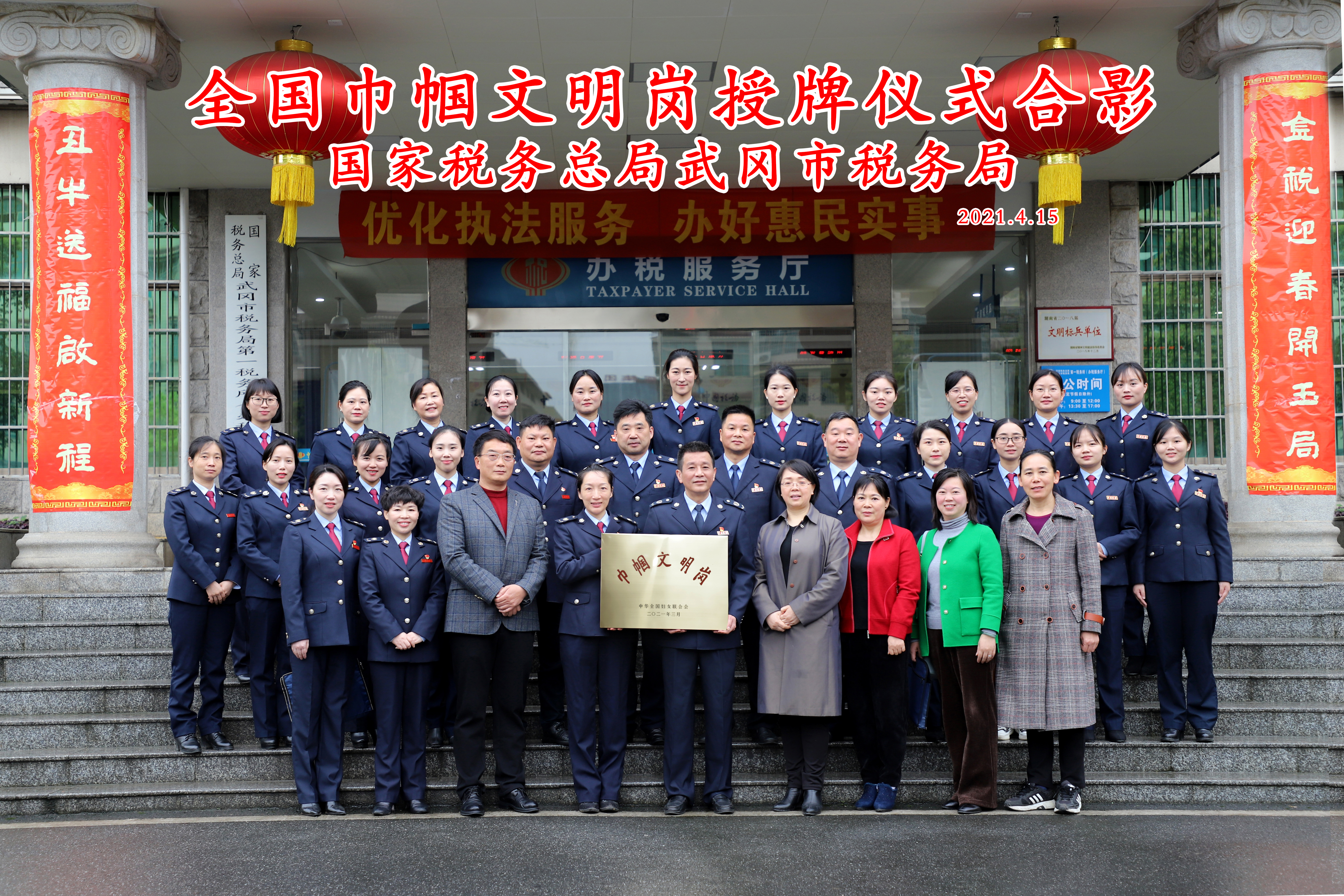 4月15日上午,邵阳市妇联党组书记、主席辜红姿带队来到武冈市税务局,为国家税务总局武冈市税务局第一税务所(办税服务厅)授予“全国巾帼文明岗”荣誉奖牌。仪式由邵阳市税务局税收风险管理局局长、系统妇联代主席姚艳凤主持, 邵阳市妇联二级调研员岳红艳、邵阳市妇联四级调研员杨志芳、武冈市妇联主席张菊云、邵阳市税务局党委委员副局长刘湘和、邵阳市税务局系统党建科副科长系统妇联常务副主席马艳等陪同。