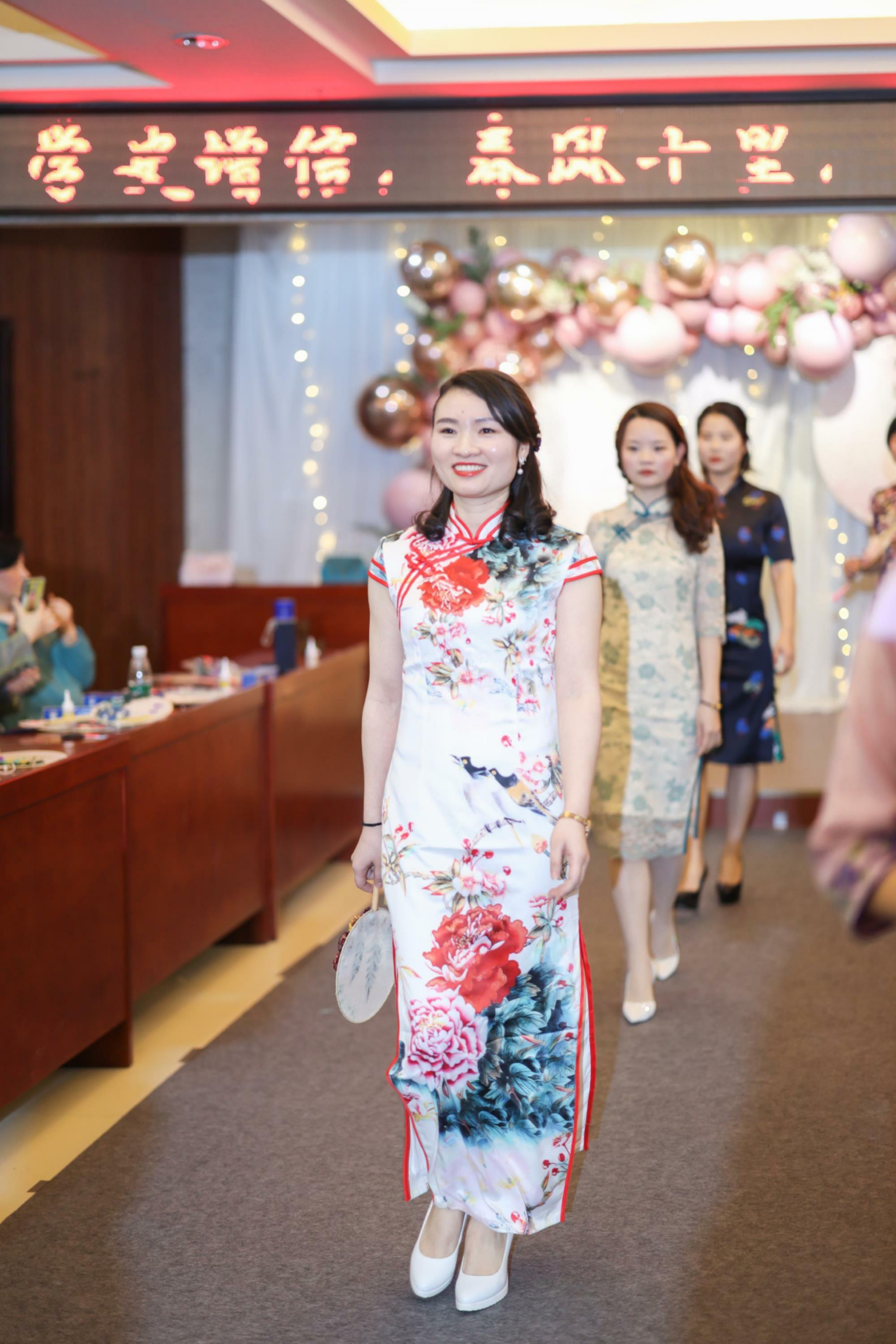 答题结束后,女职工们身着旗袍,手执团扇,在悠扬的乐曲伴奏下款款而来进行走秀展示。婀娜的身姿、优雅的步伐,展示着她们端庄典雅的韵味和自信向上、积极健康的良好精神风貌。