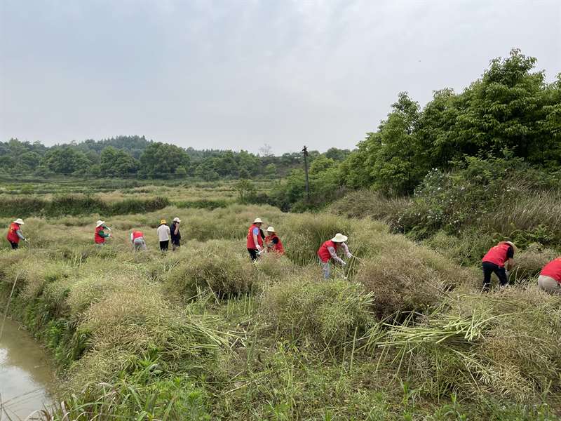 5月6日上午,雨溪街道河洲社区油菜地里,一群穿着红马甲的志愿者,正在躬耕收割。烈日当头,汗水浸透了他们的衣衫。一上午的时间,2亩油菜被抢割收获,绿油油的山岗,摆放着一堆堆油菜。