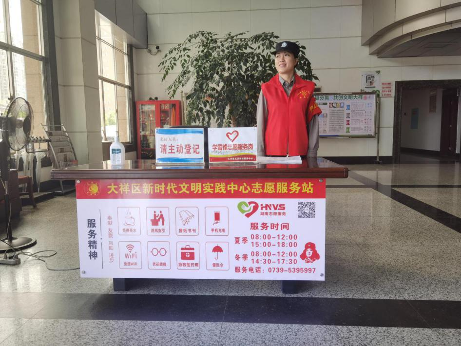 志愿服务是一面精神旗帜,更是一种文明导向。大祥区新时代文明实践中心志愿服务站由志愿者轮流上岗服务,秉承“立足岗位、服务群众”的原则,积极主动为广大办事群众提供咨询、引导、指导等服务,切实推动解决群众办事难的困扰。在志愿服务站里面还提供免费茶水、路线指引、报纸书刊、手机充电、老花眼镜、爱心雨具、慈善药箱和失物招领等一系列志愿服务,提供的服务涉及方方面面,深受办事群众的欢迎。