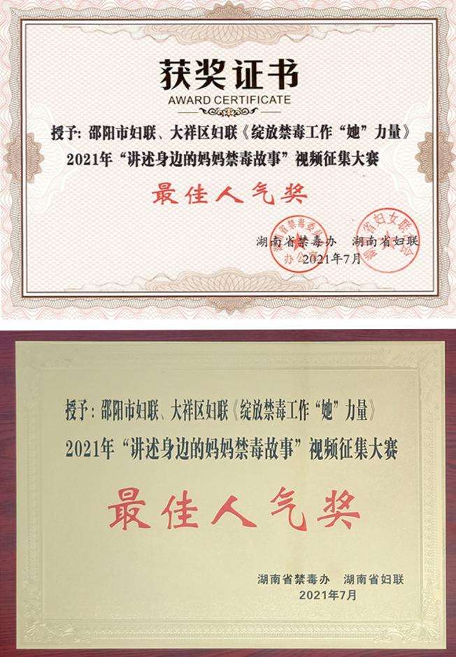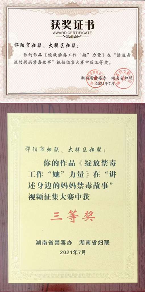 日前,在湖南省禁毒委员会办公室、湖南省妇联、湖南省禁毒协会主办“讲述身边的妈妈禁毒故事”颁奖仪式暨“湖南省禁毒协会妈妈禁毒分会”成立仪式上,大祥区妇联选送作品《绽放禁毒工作“她”力量》荣获三等奖、最佳人气奖两个奖项。
