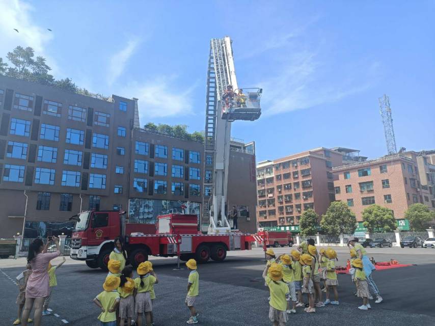 活动中,指战员带领幼儿师生们参观了整齐摆放的灭火救援装备器材,并用通俗易懂的语言介绍了灭火器、防静电手套、绝缘剪、切割器、水带、战斗服等装备器材的功能和用途,并现场使用展示。随后,孩子们在指战员和老师的带领和保护下,先后登上了云梯车及水罐车,进行了“别开生面”的体验。指战员还通过城市主战车展示了车辆出水情况,并结合夏季火灾防控重点,向师生们介绍了夏季防火注意事项和逃生自救常识,指导如何正确报火警,进一步激发了孩子们对消防安全知识的浓厚兴趣。
