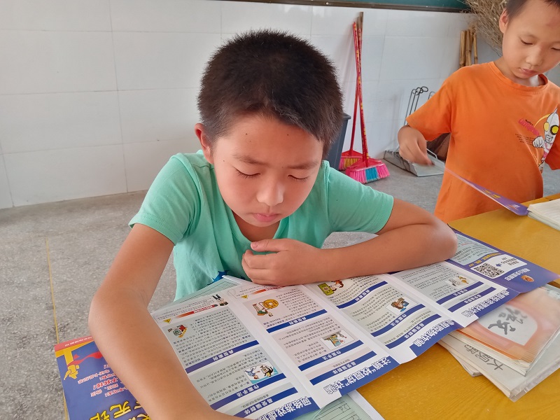 沉浸在彩页资料中看故事看案例的小学生。