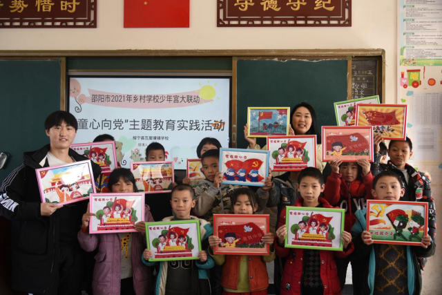 当日的活动,由邵阳学院的党员老师带队,带领9名艺术设计学院的学生党员和入党积极分子,邀请了邵阳市75岁高龄的老志愿者石泉老师助阵,老中青结合,举办了“童心向党书法展”、湖湘“红色文化艺术展”,开设了“童心向党纽扣画”、“童心向党书法课堂”、“童心向党布贴画”、“红军包手工”、“童心向党手绘团扇画”、“童心向党主题班会”、“童心向党树叶贴画”等7个实践课堂。艺术展以百年建党为主线,60幅书法作品,500余件文创作品传承红色基因、传递红色能量。在实践课堂中,同学们利用各种布贴材料,粘贴出了“永远跟党走”、“党在我心中”等作品;在色彩斑斓的纽扣上绘制出了中国地图、党旗、国旗、天安门;在接受书法艺术熏陶的同时,动手写下了“童心向党 永远忠诚”书法作品;主题班会上,师生互动,学党史,感党恩,聊起了邵阳“红”,有祖籍邵阳洞口县的蔡锷竖起护国大旗,有见证烽火岁月的邓小平征战绥宁指挥所、塘田战时讲学院、八路军驻湘通讯处旧址。