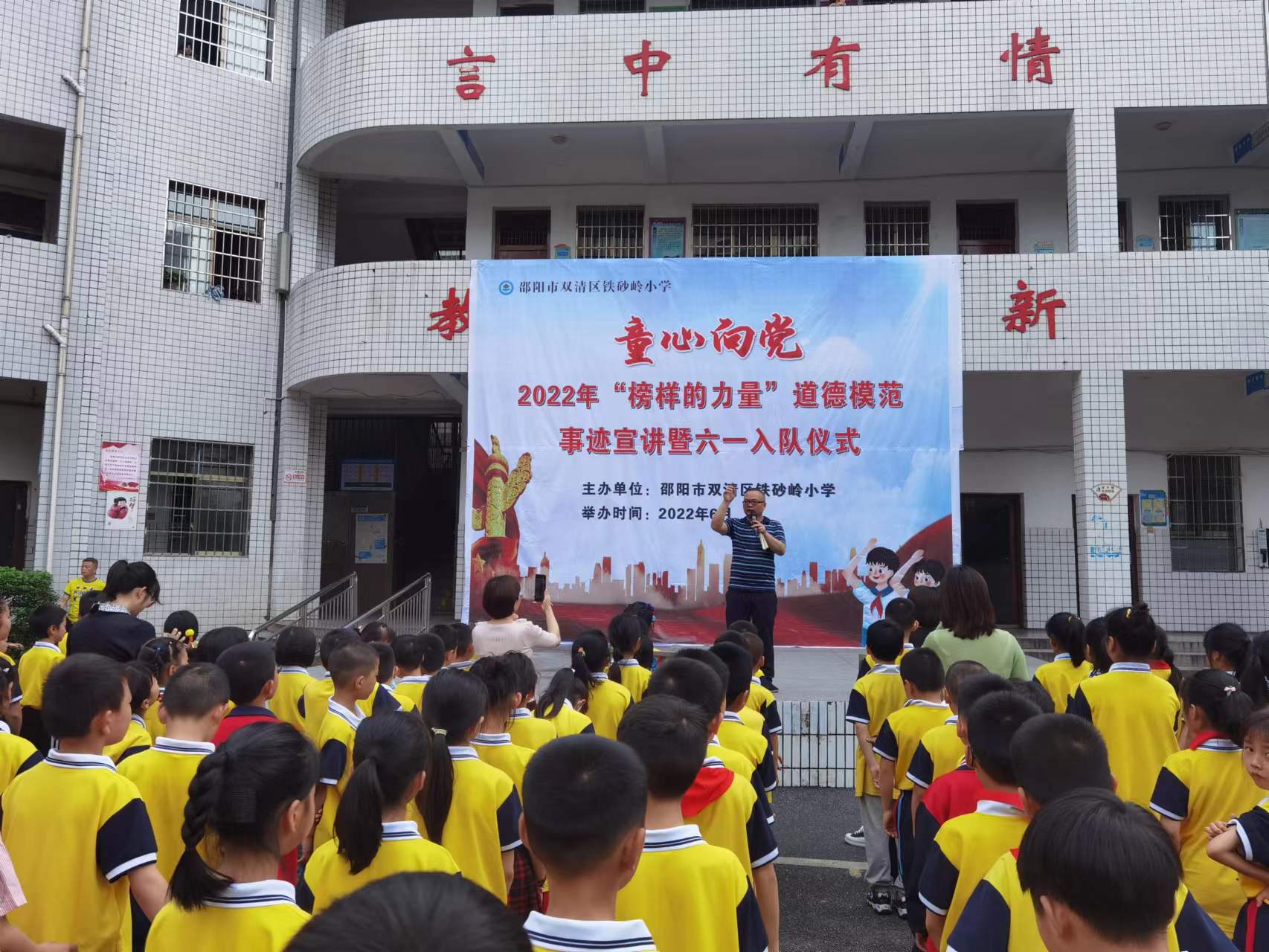 为了让学生过一个有意义的儿童节,6月1日,邵阳市双清区铁砂岭小学以“少先队入队”为契机,开展了“榜样的力量”道德模范事迹宣讲暨六一入队仪式。