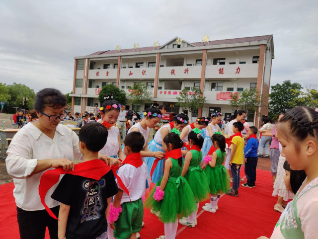 接着举行的是少先队员入队仪式。在鲜艳的五星红旗下,队旗迎风招展,少先队员手中的红领巾像熊熊火焰在跃动。仪式上,新队员们充满了激动和自豪。大队辅导员戴老师宣读着仪式的程序,所有的队员都认真聆听,心潮澎湃。在《我们是共产主义接班人》的动人旋律中,老师们和老队员们为新少先队员戴上鲜艳的红领巾。