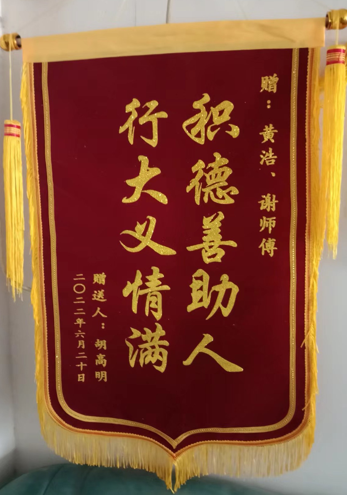 2022年6月21日,市民胡先生激动地带着“积善德助人, 行大义情满”的锦旗来到扬子巴士二分公司,感谢爱心值班员黄浩和6路线驾驶员谢小周。