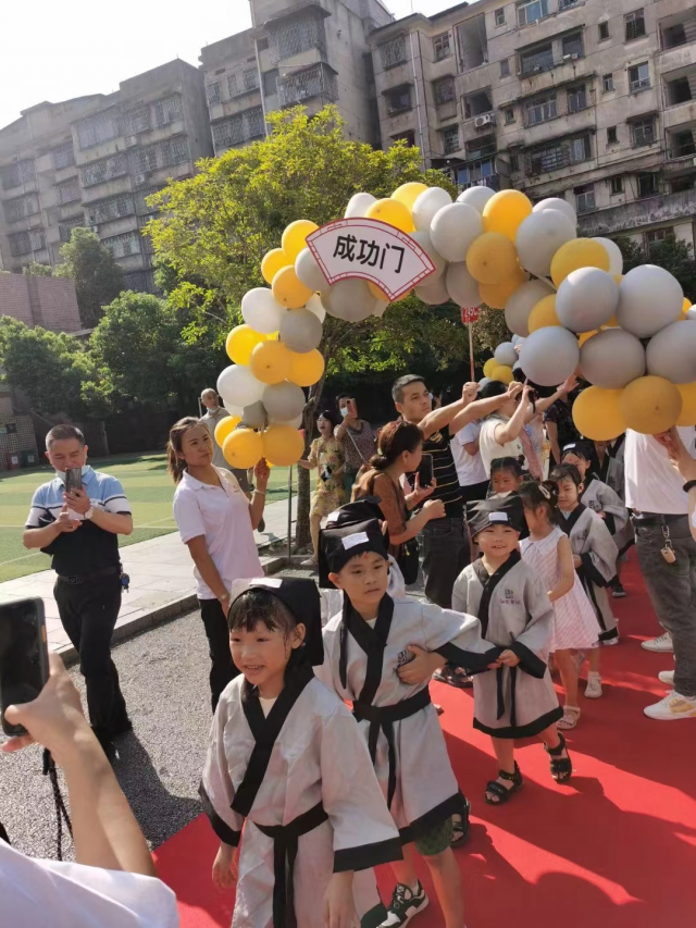 最后,学生和家长在老师的带领下俩俩牵手,依次走过学校领导、老师和爸爸妈妈们共同搭建的理想之门、求学之门、奋斗之门、成功之门,寓意着孩子们将成为一个有理想抱负、向上向善、有才有德的阳光少年。