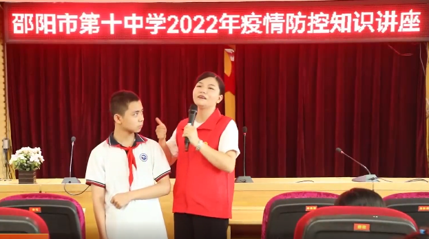 第一站,健康科普志愿者们走进了邵阳市第十中学,为学校师生们带来了疫情防控、青少年近视防控、口腔健康三个方面的科普知识讲座。邵阳学院附属第二医院健康科普宣讲团的赵清清、邓展锋、胡佳蓟三位讲师用通俗易懂的语言、脍炙人口的科普歌曲和趣味横生的互动游戏,让整个科普课堂气氛活跃、生动有趣,同学们纷纷表示非常喜欢这样的课堂。