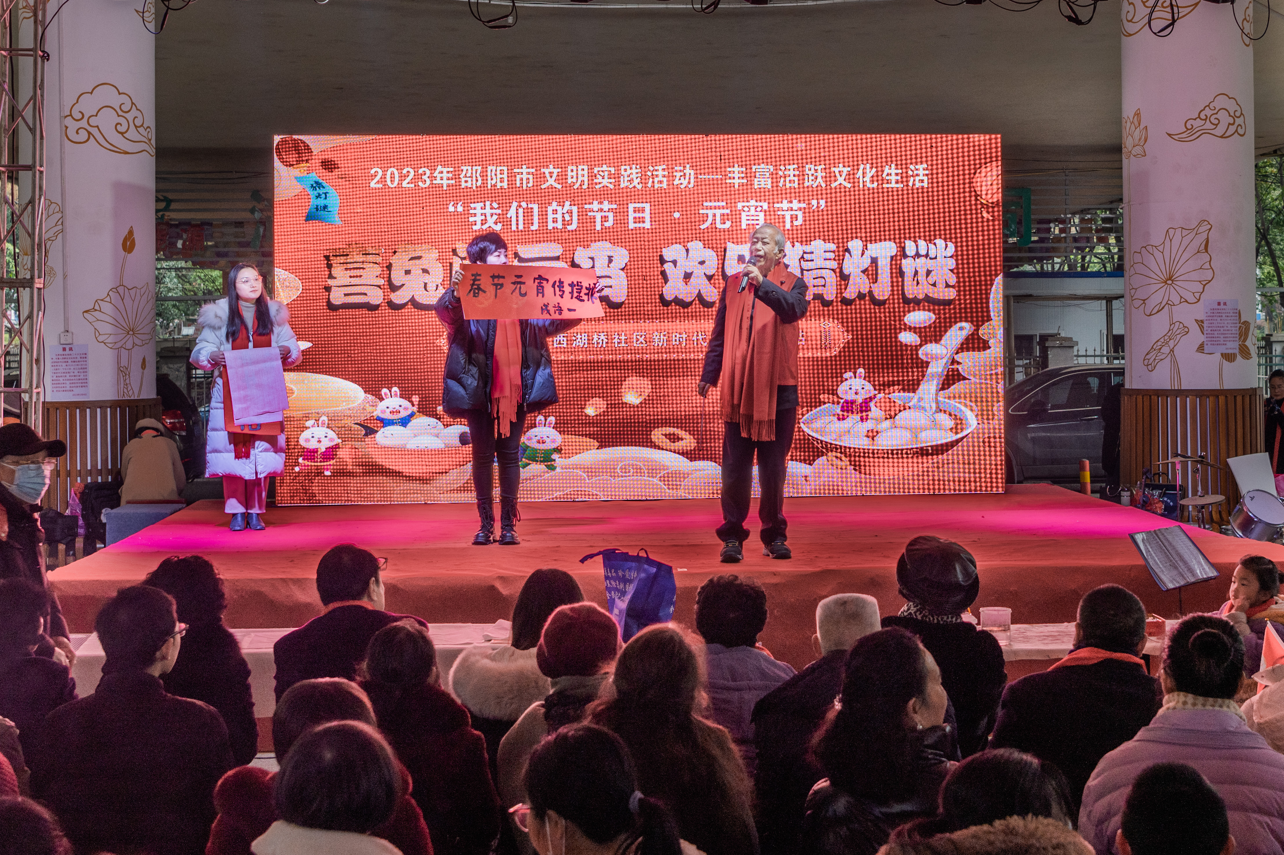 2月5日下午,一由邵阳市文明办、市文联、北塔区委宣传部主办,邵阳市中国传统文化研究会承办,北塔区状元洲街道西湖桥社区协办的主题为“喜兔闹元宵,欢乐猜灯谜”的元宵活动在北塔区状元洲街道西湖桥新时代文化实践广场举办,1000余名群众欢聚一堂,共聚欢乐时光。