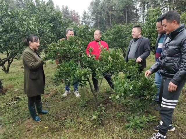 蒋清金(左三)带领村“两委”到村集体经济脐橙园了解脐橙长势