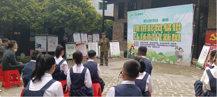 活动中,抗美援朝老英雄宁顺华动情地回忆起艰难的抗战之路,带着大家一同走进那段战火纷飞的峥嵘岁月,宁顺华告诉大家,这辈子他只有一个信念,那就是永远跟党走,永远做党的忠诚战士!大家听后思绪万千,眼角中流露出对革命英雄的无限敬仰。随后,洛阳洞小学的学生齐诵《向先烈先贤报告》,深切缅怀革命先烈的丰功伟绩,尽情表达着爱党爱国之情,孩子们一句句稚嫩的话语,一声声深情的呼唤,呈现出对先烈先贤无尽的感恩和敬仰,带来的是满满的感动。双清区社工站的社工们还为大家带来移风易俗快板表演,唱词通俗易懂,内容贴近生活,围绕移风易俗、文明祭祀、绿色环保等题材向大家传递时代新风尚、新理念,号召大家争做文明祭祀的实践者、科学祭祀的倡导者、安全祭祀的引导者。