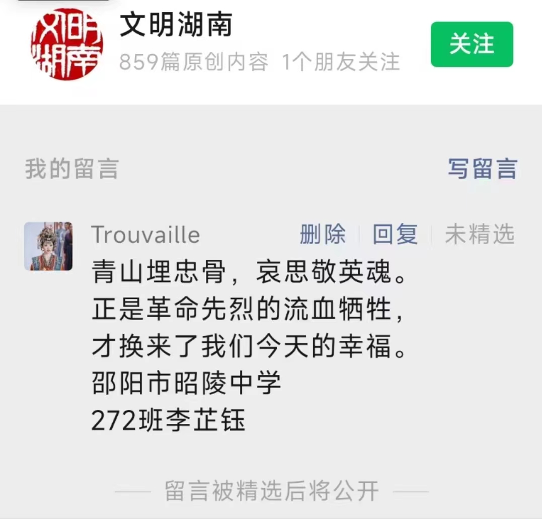 序春草绿,又到清明。3月31日起昭陵中学组织学生登录湖南文明网,向先贤先烈鞠躬献花、签名寄语、撰写体会,把自己对历史的铭记,对革命先辈的缅怀,对幸福生活的珍惜,对个人理想的追求融入其中,以自己的方式开展祭英烈活动。