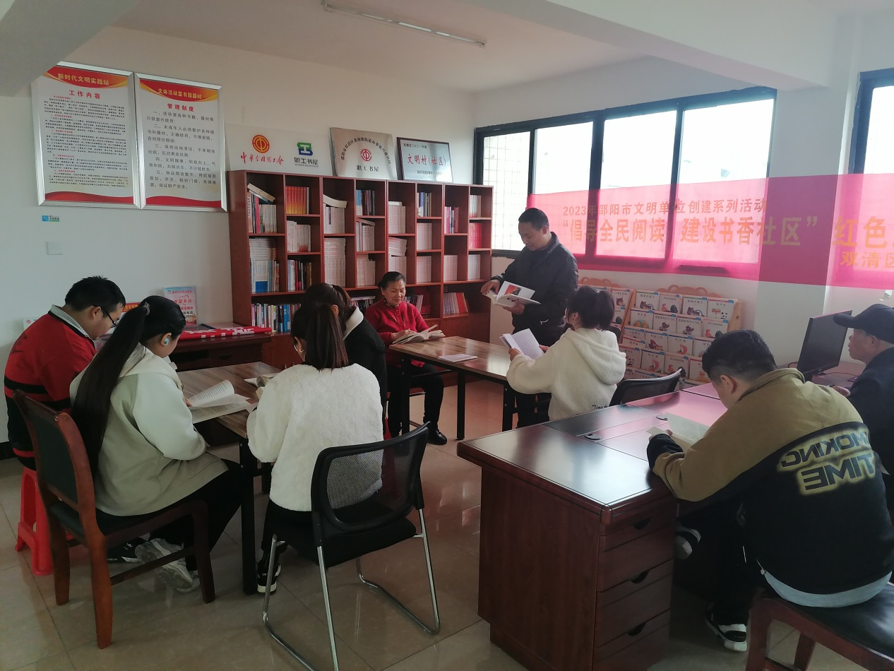 社区还组织读书分享活动,动员居民参与“倡导全民阅读,建设书香社区”经典读书分享活动,积极参加和学习爱国知识,传播优秀书本知识文化,提高个人知识文化素质。让居民进一步了解知识书本文化、认同知识书本文化、喜爱知识书本文化、读好书本知识文化,增强爱国情感,提高文明素质,做名副其实的文明城市文明人。