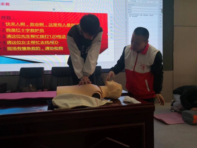 培训分为理论学习、操作示范和实操练习三个环节进行。在理论学习环节中,授课老师从红十字运动简介、应急救护概述、院外急救生存、气道异物梗阻的急救等四方面进行详细讲解,重点讲解了心肺复苏要把握的“黄金4分钟”、跌倒坠落救助应把握的“白金十分钟”和异物堵塞的海姆立克急救法等应急救护知识。并利用人体模型细致讲解了如何判断是否需要对病人进行心肺复苏及操作流程、方法、注意事项和停止操作的条件,并向大家演示了心肺复苏的实用操作技能,让学生们在模拟人体道具上进行心肺复苏的实操演练,以便更好地熟悉和掌握相关应急救护技能。
