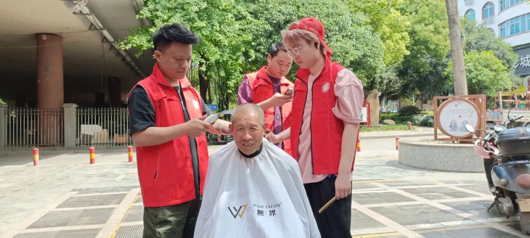“大家别着急,全部剪完我们再回去”。5月4日中午12点的西湖桥新时代文明广场,十余名居民排队在“状元红爱心义剪”现场等候剪发,来自双清区志成新世界“無界美发沙龙”的志愿者丁丁正耐心的答复着大家。