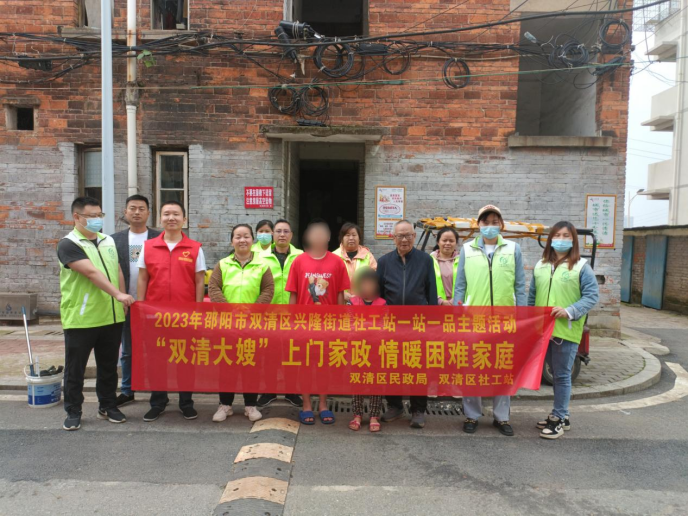 5月13日,在邵阳市双清区民政局的指导下,双清区兴隆街道社工站、邵阳市尚德社会工作服务中心、爱儿家家政服务公司的10名社工、志愿者携手走进兴隆街道龙皇桥社区炭黑厂生活区,为低保户陈治国开展“双清大嫂”上门家政服务。