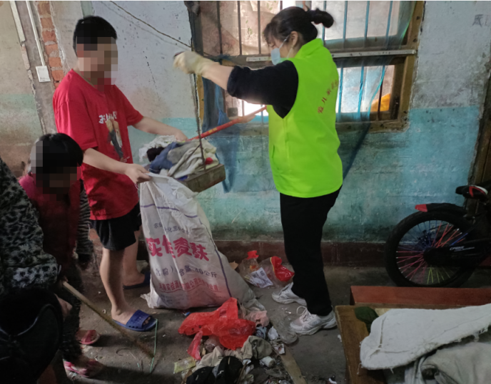随后,志愿者各自分工,立即动手,帮助陈治国收拾衣物、整理杂物、擦洗灶台、清扫卫生、清洗餐具、清运垃圾……,忙碌的身影在房内屋外来回走动,整个工作场面热火朝天。在打扫的同时,社工们与陈治国及其子女拉起了家常,了解他们家庭的生活、身体状况以及孩子的学习情况,并向他们宣传儿童福利政策,进行防溺水、防性侵教育,叮嘱他们注意健康和安全,有困难及时与社区或社工沟通联系。