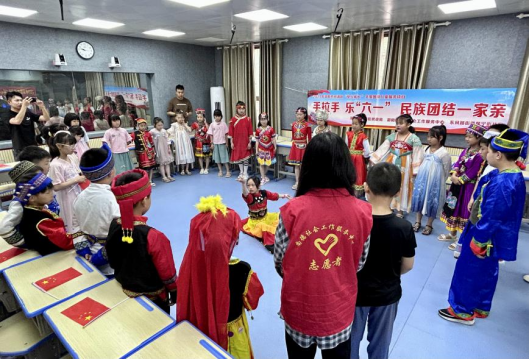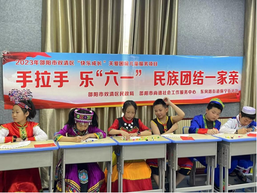 邵阳文明网6月1日讯 少年儿童是祖国的未来,是中华民族的希望。为深入贯彻落实党的二十大精神,深化未成年人民族团结进步教育,让各族儿童感受到节日的快乐和社会对他们的关爱,5月30日,在第41个民族团结教育月期间和第73个六一国际儿童节来临之际,邵阳市双清区民政局与邵阳市尚德社会工作服务中心的社工、志愿者们来到东风路街道保宁街社区,开展“手拉手 乐‘六一’ 民族团结一家亲”活动。通过主题创意绘画、民族习俗介绍、文艺表演、安全自护教育、赠送小礼物等形式与各族儿童共促团结、欢庆“六一”。