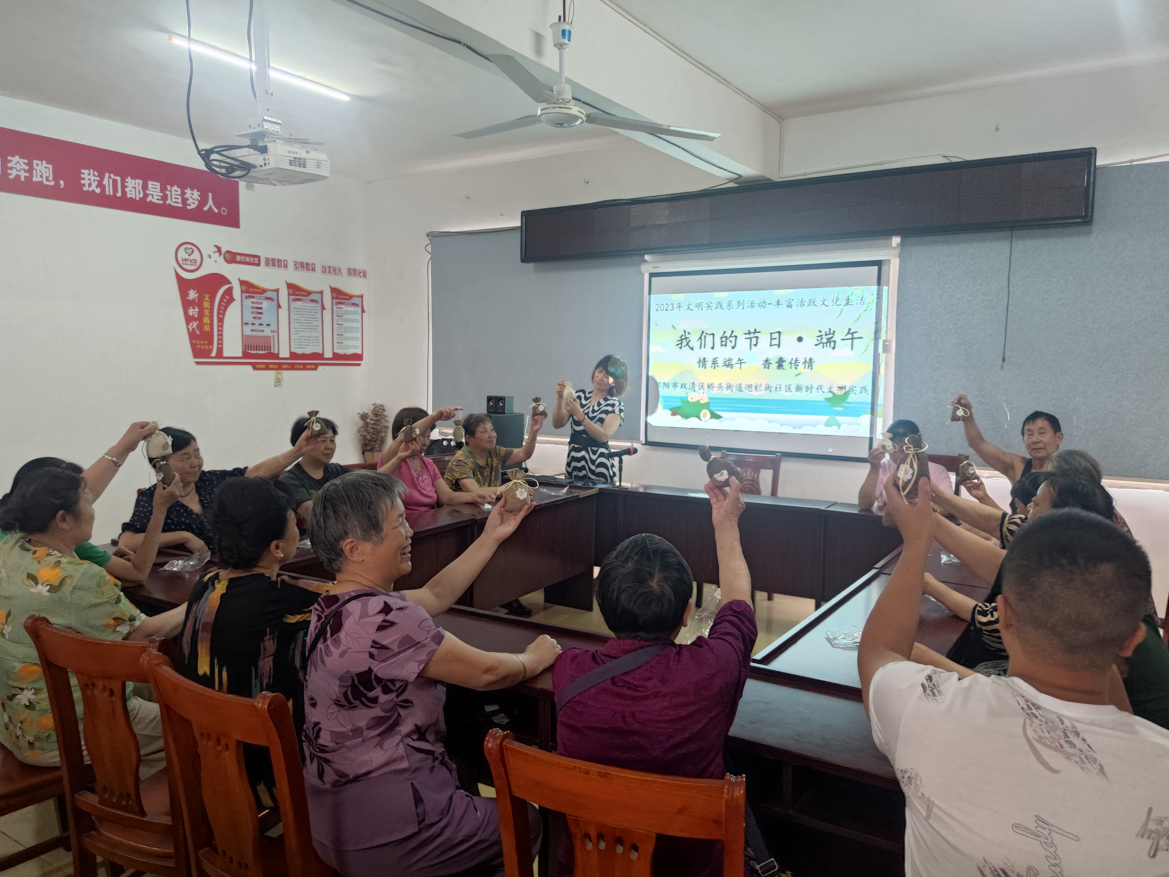 活动现场,工作人员介绍了端午节的由来与习俗,通过课件观察讨论,了解了赛龙舟、吃粽子、佩香囊、悬艾叶菖蒲、饮雄黄酒等端午节习俗。大家欢聚一堂,齐动手,穿针引线,用各色布头包上香药,缝制自己喜欢的五彩缤纷的香包。不到两个小时,个个小巧玲珑、五颜六色、形态各异的香包呈现在了眼前,同时为前来居委会办事的居民分别赠送香包一个,相互之间拉近了居民之间的距离,同时建立了深厚感情从大家欢声笑语中充满浓郁的端午气息。