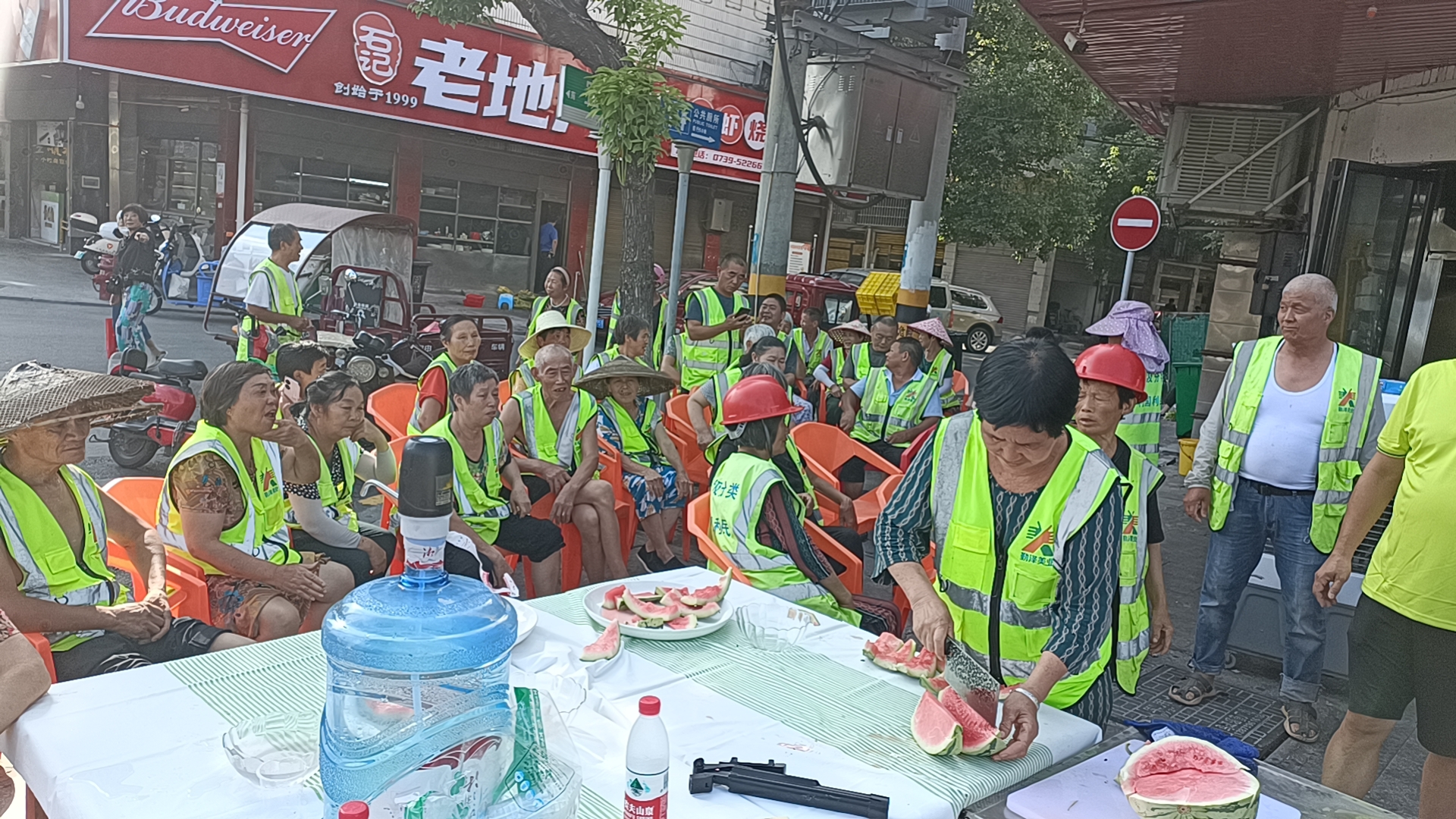 邵阳文明网7月18日讯 “大家先吃好解解渴,一会每人还领一个回去”。洒水车司机刘大哥一边招呼大家吃西瓜一边“宣布”好消息。7月17日下午4点,100余名身着印有“垃圾分类 利国利民”绿背心的环卫工人聚集在状元洲街道夜宵一条街的“哈哥哥烧烤”门店前,大家围坐着大餐桌,乐呵呵地吃着新鲜的大西瓜。