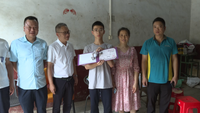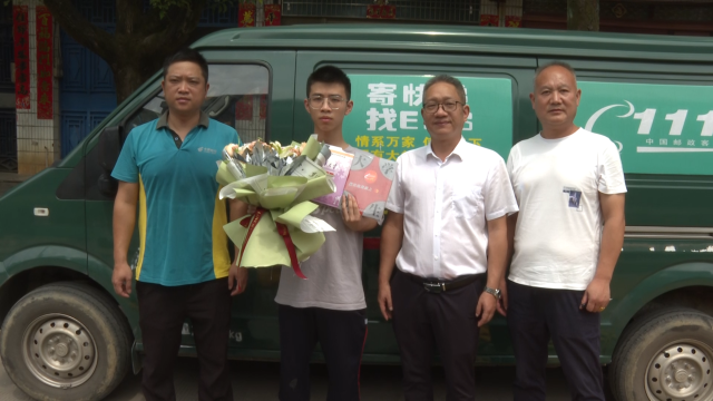 上午10点20分,在曾庆权家门口,投递员仔细核对身份证、准考证后,将录取通知书和一束鲜花送到他手中,一同见证他金榜题名的重要时刻,鼓励他用奋斗点亮青春,书写更加精彩的人生,他和他的家人激动不已,并高兴地说道:“谢谢邮政工作人员,冒着高温,给我送来了好消息,第一时间接到录取通知书,我感觉特别开心。”毕业于洞口县第一中学的曾庆权同学,今年凭借优异成绩被清华大学土木类专业录取。