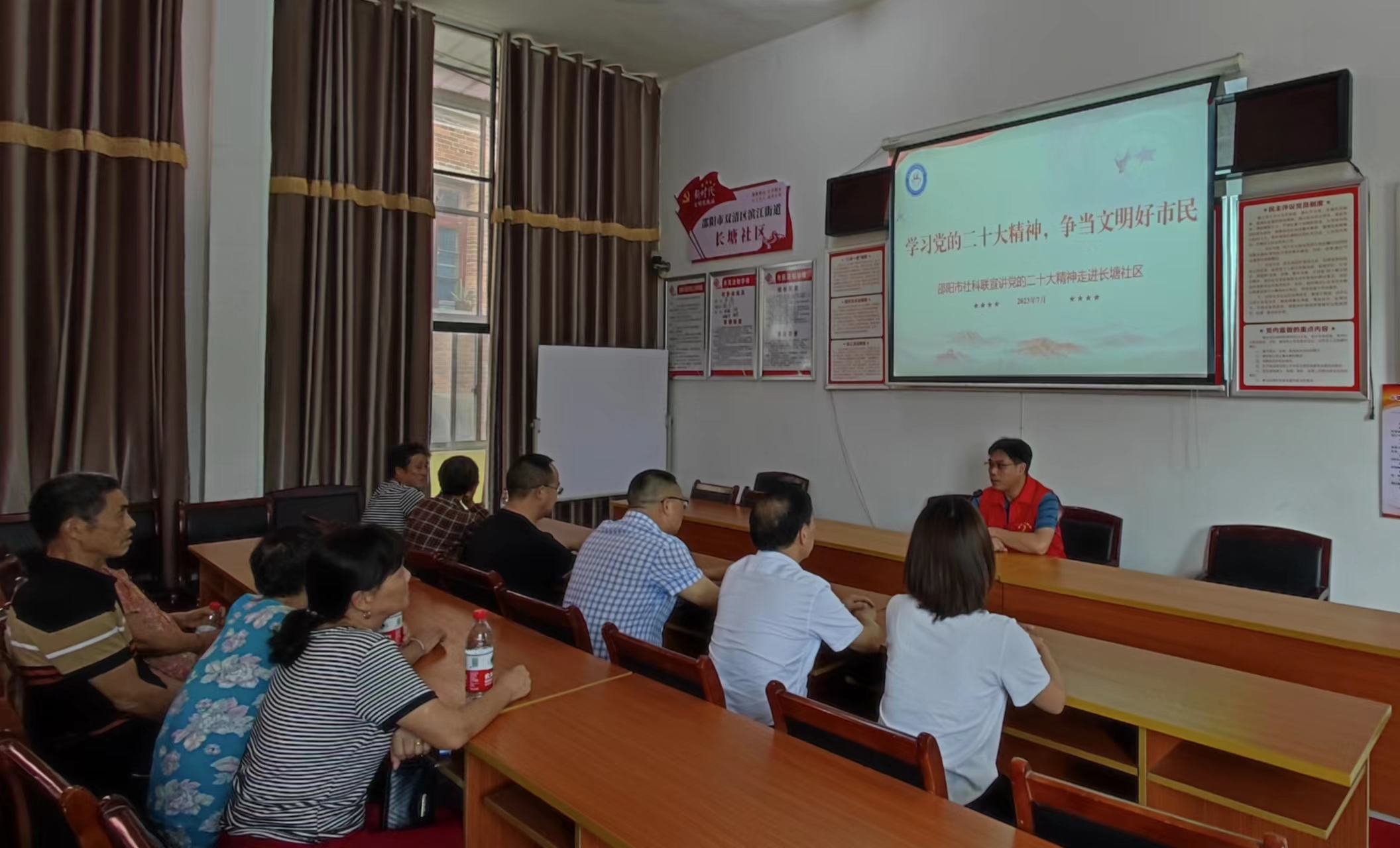 随后,市社科联新时代文明实践宣讲志愿者队伍深入双清区滨江街道长塘社区,市社科联党组成员、副主席李毅向社区居民作了《学习党的二十大精神 争做文明好市民》宣讲。活动结束后,党员志愿者和入党积极分子开展了整理社区图书室、垃圾分类宣传等志愿服务活动。