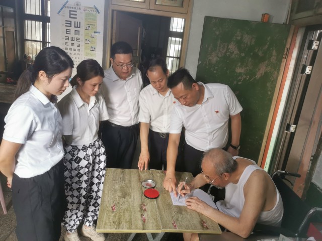 邵阳文明网8月21日讯 8月21日上午,市不动产登记中心党员先锋队迎着烈日,冒着酷暑,穿过大祥区南门口农贸市场狭窄的弄子,来到位于大祥区南门口碟子塘原市工商局家属楼上门服务,为行动不便的老人办理其名下的两套房产分别过户到其两位孙女名下,工作人员仔细地进行了询问并按要求,并请朱植老人在转让方名下签字按手膜。