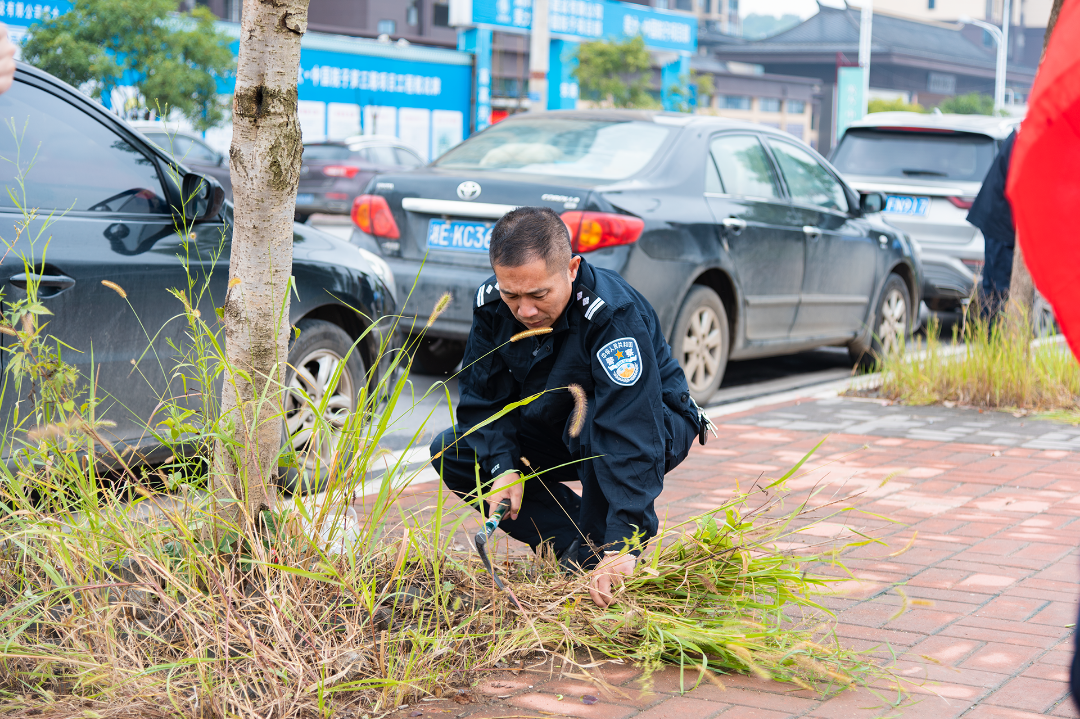 参加志愿服务活动全体党员、民辅警卯足干劲,发扬着“不怕苦、不怕脏、不怕累”的精神,对人行道上散落的落叶、杂草等进行清扫。