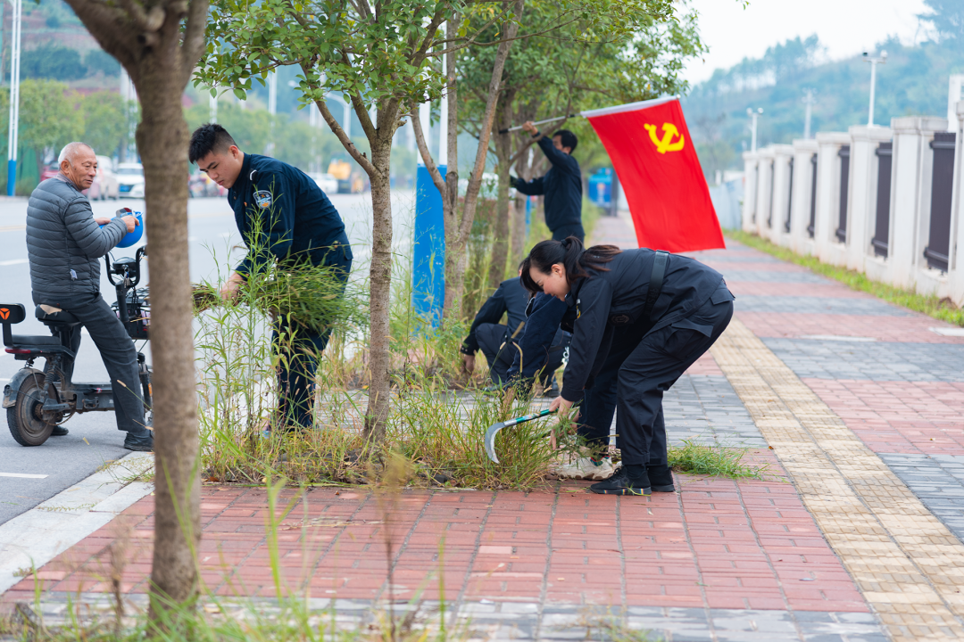 10月11日上午,新宁县公安局组织局机关各党支部党员、民辅警代表志愿者开展“创文创卫”实践活动,前往新一中、学府小区马路周边清扫垃圾、清理杂草。
