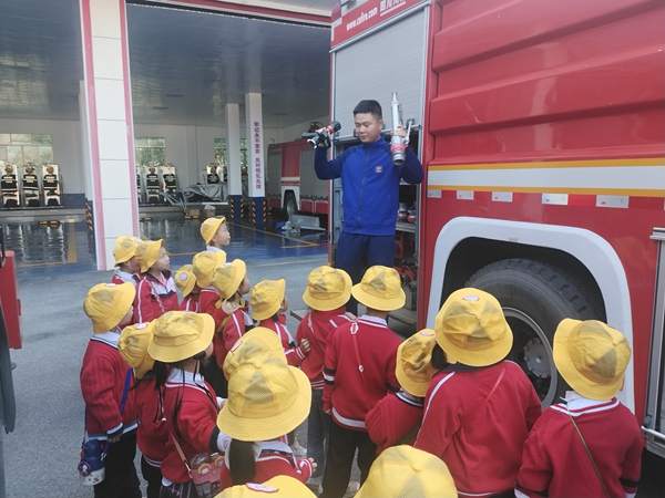 “哇!消防车的水居然可以射这么高!”“消防员叔叔太帅啦!”... ...在结束科普教育基地的学习后,小朋友们在观看消防车载炮出水项目时发出阵阵惊呼。接着在消防员的带领下,小朋友们认识了不同的消防车与消防服,近距离观看无齿锯、水枪、消防斧等消防器材,知道了消防员不只会灭火还会摘马蜂窝、抓蛇... ...为充分满足小朋友的好奇心与探索欲,消防救援人员还邀请小朋友试穿了消防灭火防护服,让大家过足了“消防瘾”。