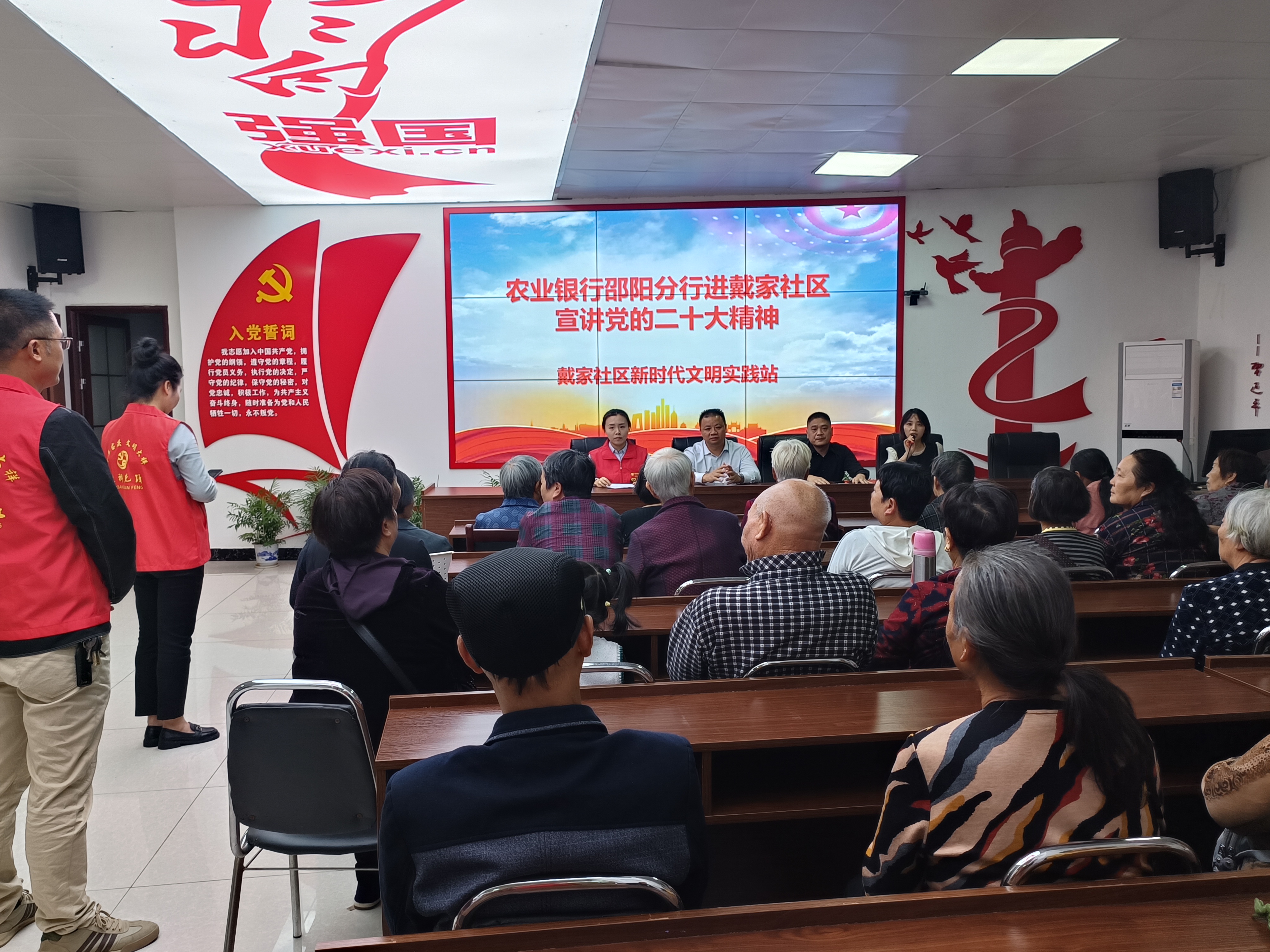 11月23日,农业银行邵阳分行到戴家社区组织开展学习贯彻党的二十大理论主题宣讲活动。宣讲会上,农业银行邵阳分行以“学习贯彻党的二十大精神 着力促进全体人民共同富裕”为主题,对党的二十大报告中关于促进人民共同富裕的重要论述进行深入解读阐释和讨论交流,还号召大家要充分认识学习宣传贯彻党的二十大精神的重大意义,全面学习、深刻领会,着力在掌握精神实质、学深悟透、融会贯通上下功夫。