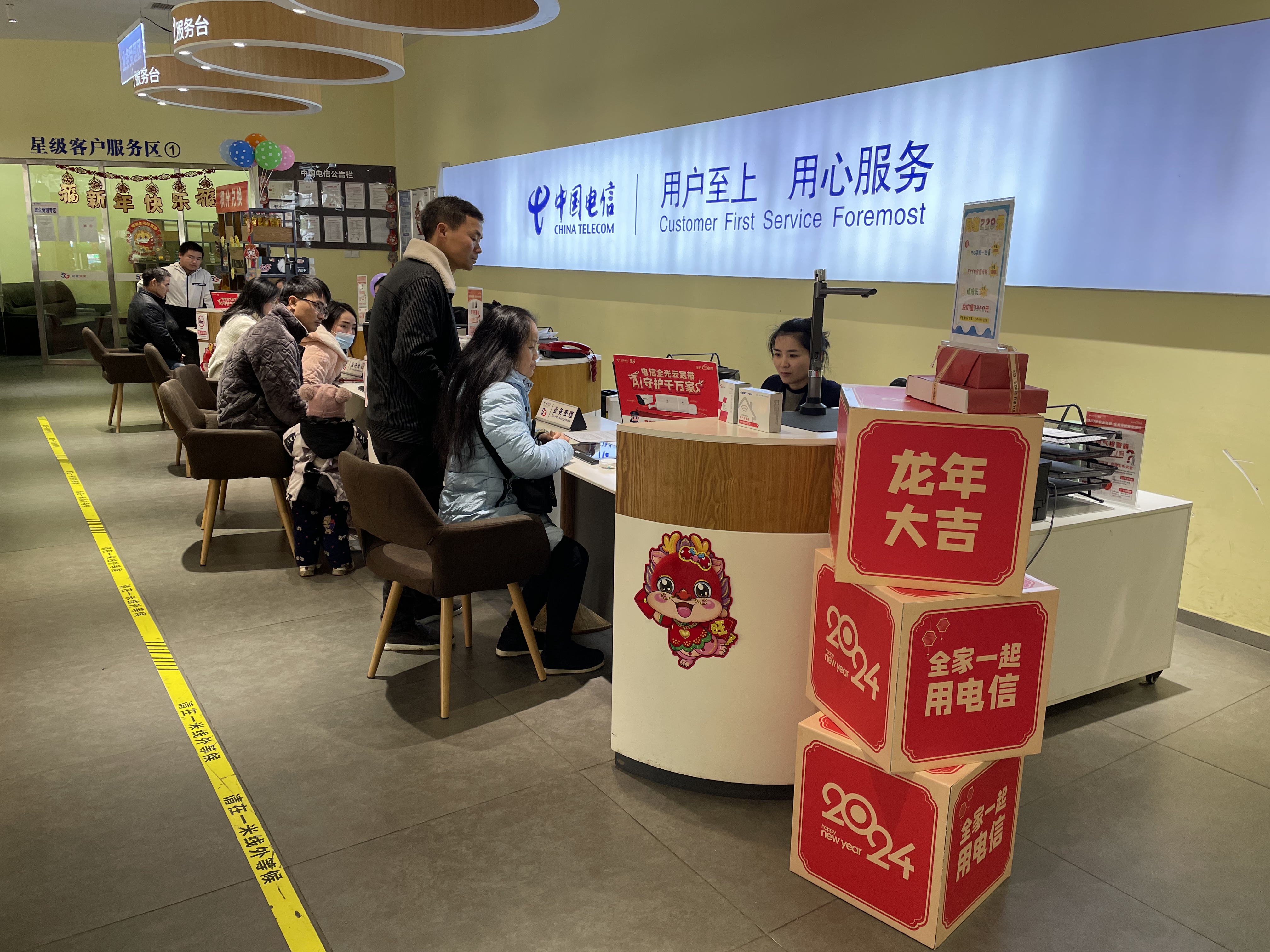 在中国电信邵阳公司五一南路营业厅,整洁明亮、秩序井然的营业环境,令人心生安全、舒适之感。大厅内喜迎龙年的精心装扮和员工的热情问候,使人感受到浓浓的年味。工作人员组织开展辞旧岁迎新春快闪活动,让到店的用户感受了中国传统文化的传承和创新,大厅前台的营业员的工作正常运行,方便客户办理各类业务,用最暖心、最周到、最专业的服务,诠释着责任与担当。当柜台积压的人过多时,营业厅的志愿者还教用户通过手机在线上办理业务,节约用户时间,提高了营业厅工作效率,以实际行动落实了“用户至上,用心服务”的宗旨。