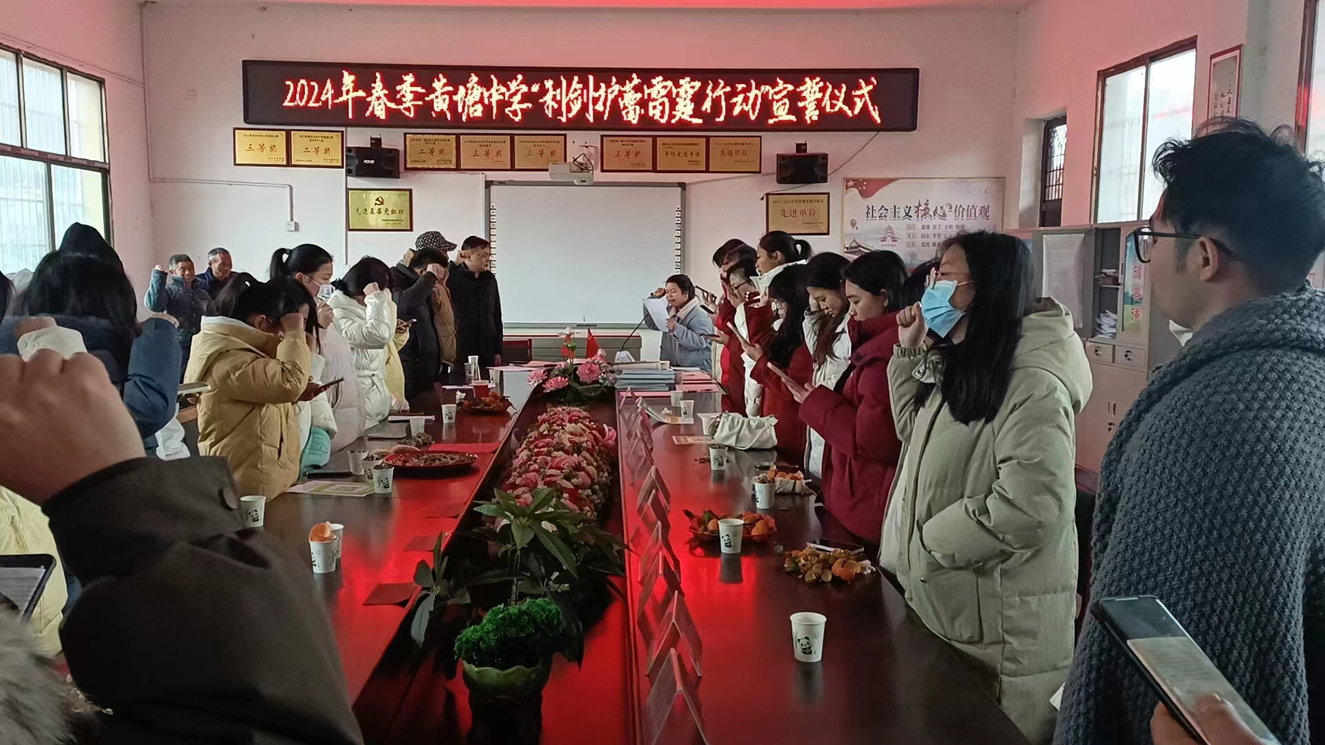 邵阳文明网3月1日讯 2月26日,武冈市邓家铺镇黄塘中学组织全体教职员工观看了《阳光护蕾》警示教育片,并举行了“利剑护蕾·雷霆行动”宣誓仪式。