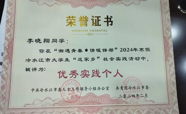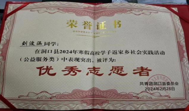 移动与应用开发专业2305班刘波涵同学在家乡洞口县参加“暖冬行动”公益志愿服务,被评为“优秀志愿者”。