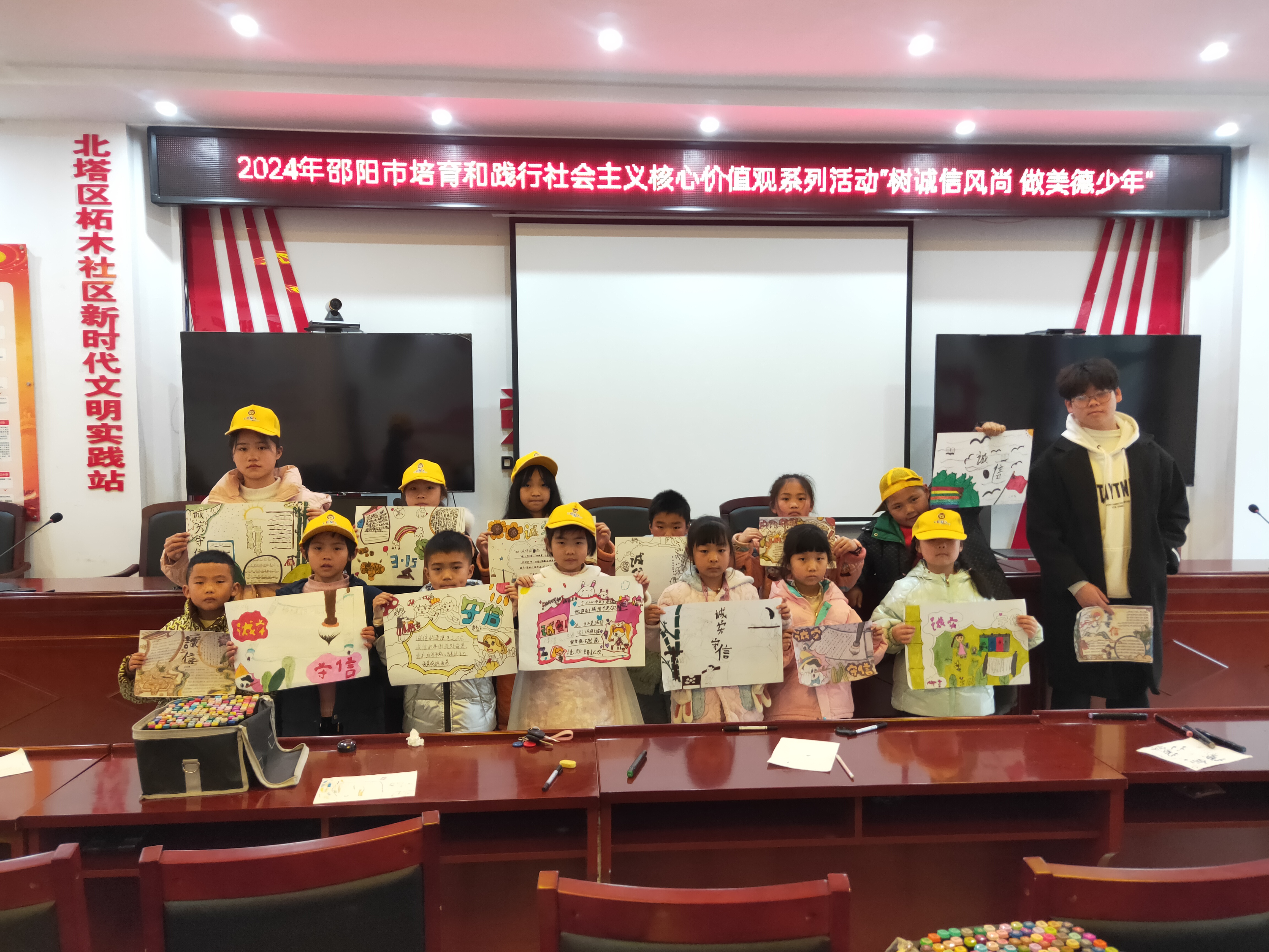 邵阳文明网讯 3月11日,北塔区柘木社区在新时代文明实践站组织开展“树诚信风尚 做美德少年”手抄报活动。积极培育和践行社会主义核心价值观,为在全社会营造起讲诚信的良好风气,全面优化城市营商环境持续发力。