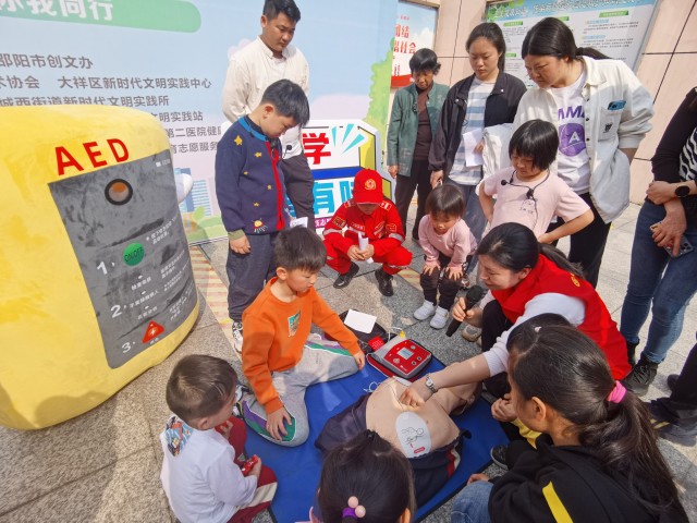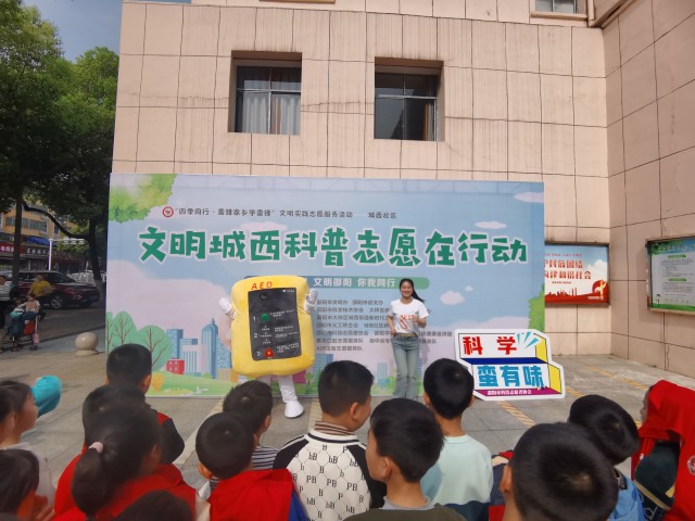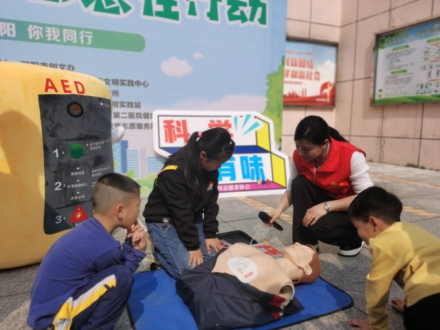 3月30日上午,市科技志愿者协会与邵阳学院附属第二医院健康宣讲团志愿者在城西街道社区参加“邵阳红.周末志愿行”活动。志愿者们运用道具、人偶,结合改编的歌曲和舞蹈表演,向社区居民普及AED使用知识。表演结束后,现场观众纷纷希望来实操练习,科普成效非常明显,现场居民很多都掌握了AED的使用方法。