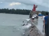 游国平着急地环顾四周,看到岸边有很多竹竿和救生圈,他立即冲着岸边的游客大声喊道:快把那些竹竿和救生圈拿过来!在游国平的带动下,周围的游客都相继加入了营救队伍当中。游国平接过竹竿双膝跪地,身子趴在海堤上手握竹竿的一头,将竹竿的另一头递到落水者手中,等他们抓牢竹竿,游国平和后面的群众齐心协力将5名落海游客一一平安救了上来。