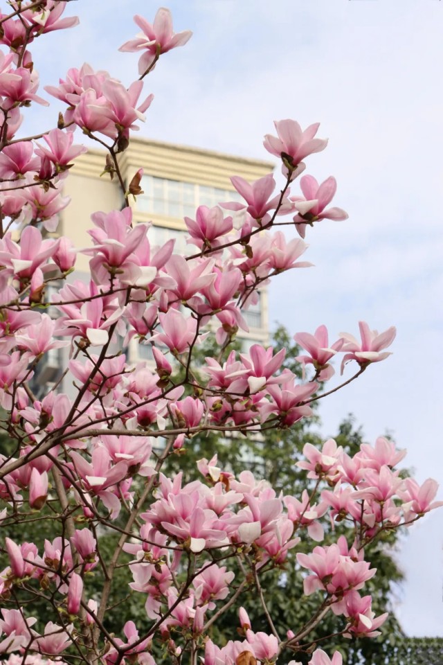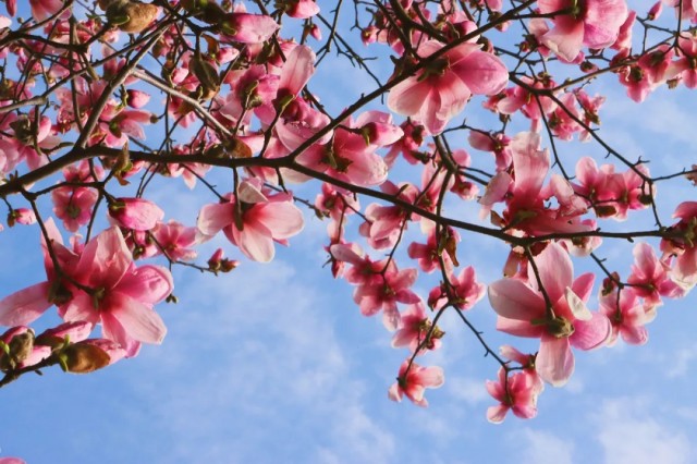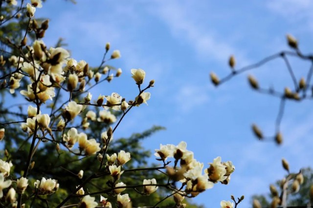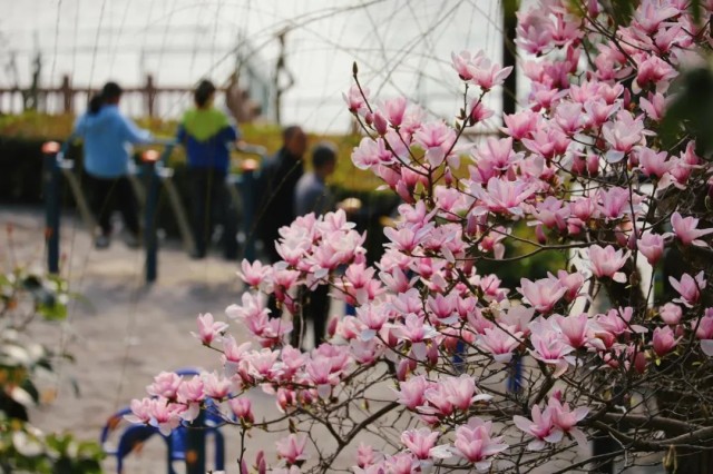 在双清公园里,姿态万千的玉兰花,迎风摇曳,神采奕奕。伴随着温暖的阳光,数百朵杯盏状花朵向碧蓝天空伸展开来,没有一丝一毫遮掩,华美浓烈。在春风的吹拂下,欢快地摇曳着,和煦的阳光顺着满树春花洒下,大家聚集在树下聊天,十分惬意。
