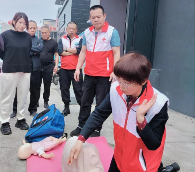 当天,双清区湘桂黔建材城摆上了一个“急救”地摊。2个模拟人,一张瑜伽垫,这个特殊摊位一摆出,便吸引了许多周边商户驻足观看。“上身前倾,双臂伸直,垂直向下用力,按压注意节奏,跟着我数01、02、03……”志愿者通过理论讲解和实操演练,向群众讲解并演示了心肺复苏、气道梗阻等急救方法和应急救护知识,指导群众现场对模拟“伤员”进行心肺复苏急救等技能操作,并一一解答群众所提出的问题。