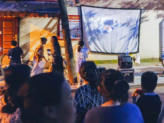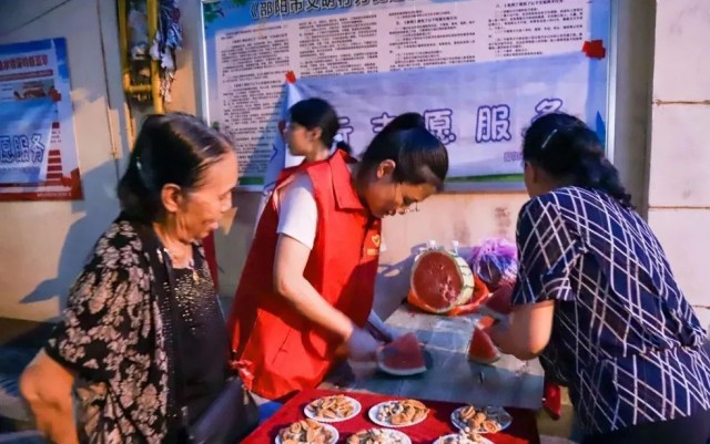 社区广场播放着经典老电影,老人们手执蒲扇,沉浸在怀旧氛围中,时而低语,时而欢笑。身着红色马甲的志愿者穿梭其间,为观影居民递上冰凉西瓜。