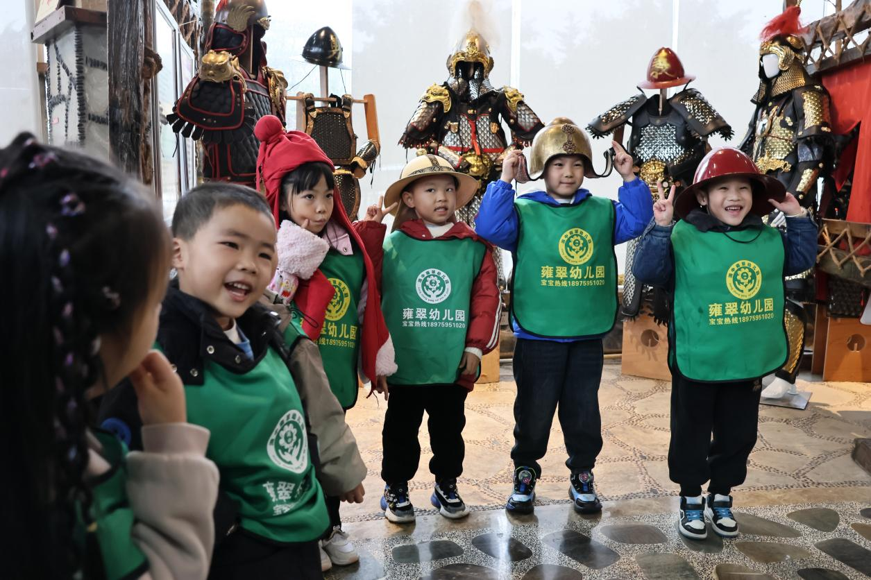 展览现场,幼儿园的小朋友们在老师的带领下,兴致勃勃地参观。孩子们的眼睛里闪烁着好奇的光芒,当看到威武的甲胄时,兴奋不已。有的小朋友还忍不住戴上甲胄的帽子,仿佛瞬间化身成了古代的将军,感受着那份威武与豪迈。他们被甲胄的威武和民族服饰的美丽所吸引,充满好奇地观察着每一件展品。这一举措,不仅让孩子们从小接触传统文化,更是一种文化传承的生动实践。
