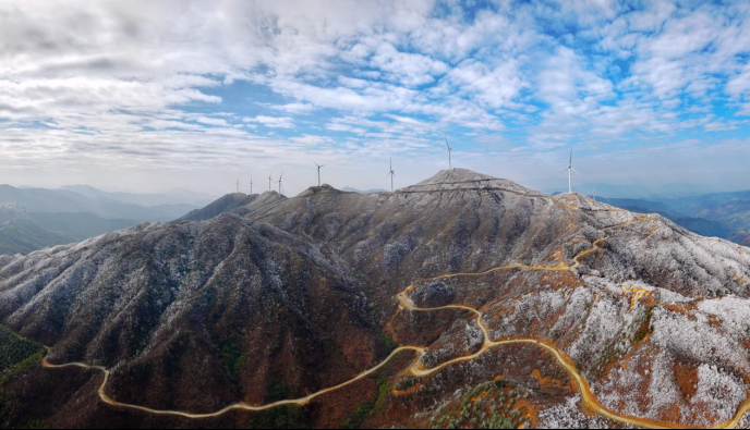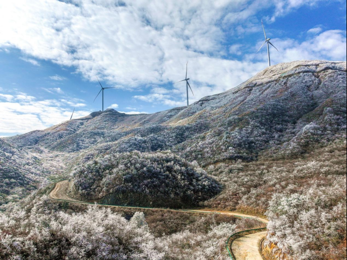 邵阳文明网讯(通讯员 鄢跃斌 林愉杰 朱巨滨)一夜寒风起,万树银花开。连日来,新宁县平均海拔1500米高寒山区的黄金瑶族乡风雨殿风力发电场迎来了今冬首场绝美雾凇景观。