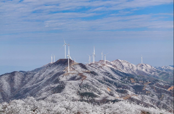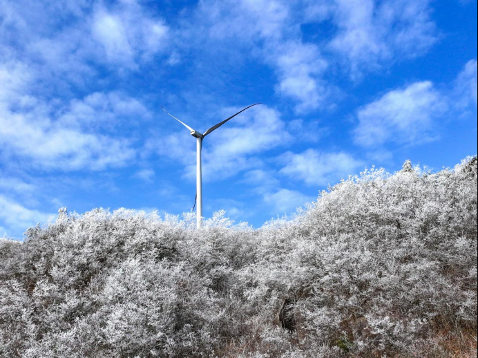 苍茫群山和蓝天白云相互交融,银装素裹,雾凇、云海、风车相映成趣,演绎着曼妙的冬日绝景,美不胜收。