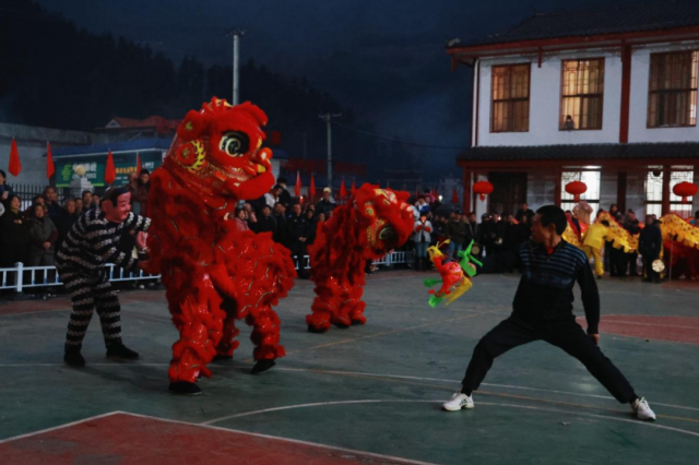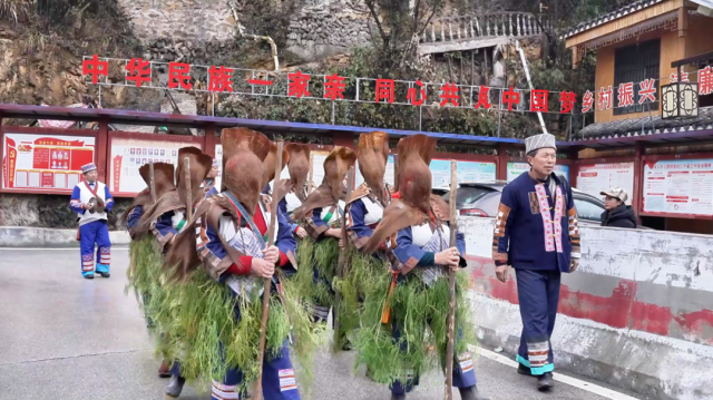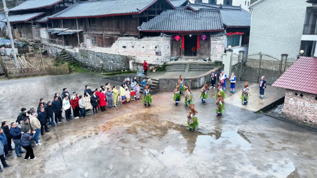 2月12日,洞口县长塘瑶族乡新时代文明实践所组织村民身穿瑶服、走村串寨,跳起国家级非遗“棕包脑”舞,欢度佳节。