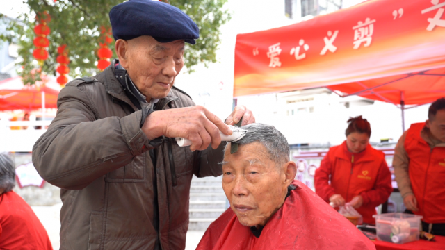 “玩转非遗”项目中,宝庆烙画非遗代表传承人唐文林和王艳萍带领群众用500℃的烙笔在手工竹纸上烙哪吒的形象。义剪区,91岁的“中国好人”廖连清一边为居民理发,一边分享自己践行雷锋精神及志愿服务的心得。他深情地说道:“把有限的生命投入到无限的为人民服务中去,这是雷锋一生的真实写照,我还要继续‘剪’出更多温暖。”