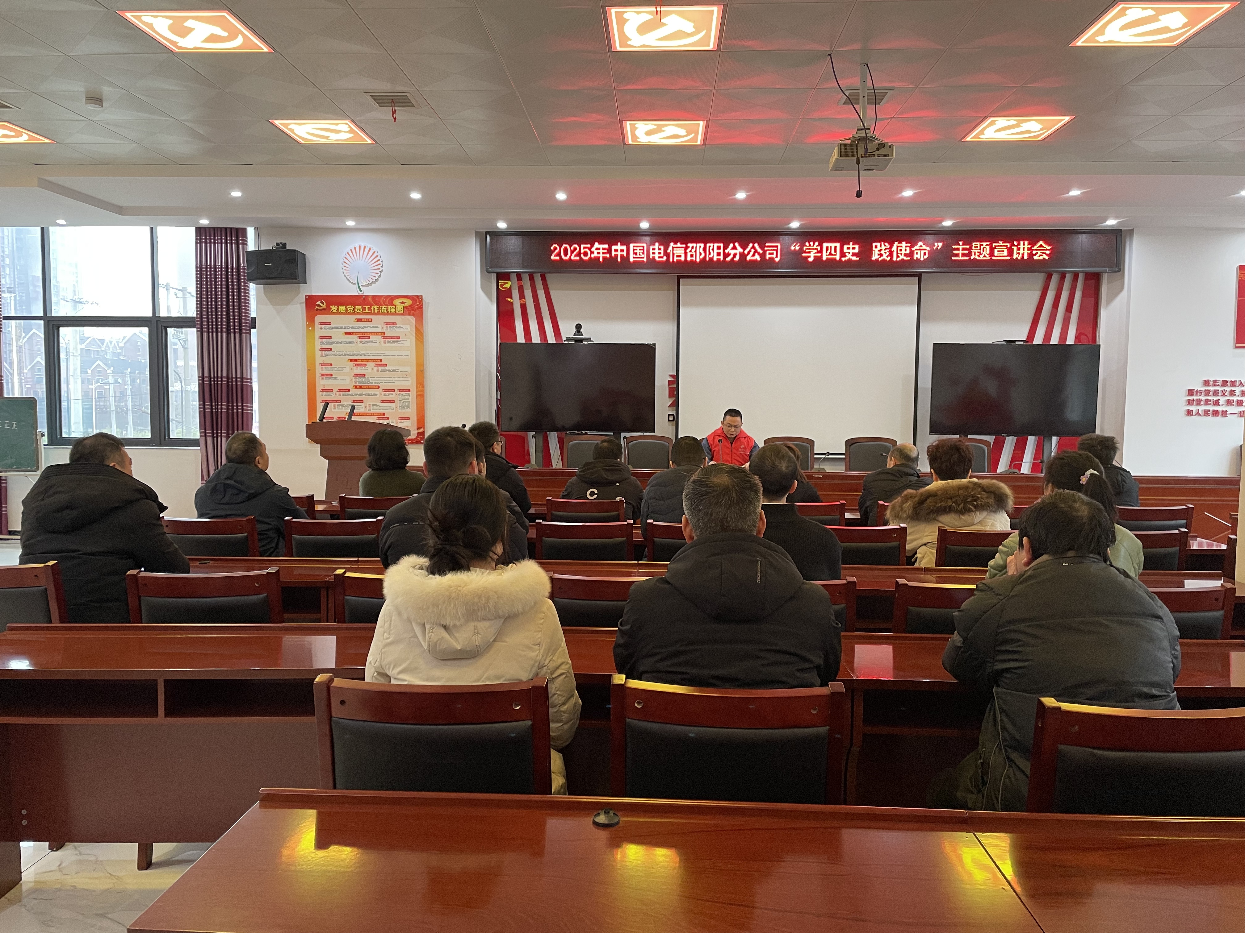 活动由中国电信邵阳分公司宣讲员主讲。宣讲员紧紧围绕“学四史 践使命”主题,从学史明理、学史增信、学史崇德、学史力行四个维度进行深入阐释,结合历史与现实、理论与实践,以一系列历史性抉择和生动案例为切入点,生动展现了中国共产党领导下的伟大历程和辉煌成就。宣讲内容深入浅出,既有理论高度,又贴近实际,让听众深刻领会到历史的智慧与力量。