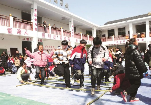隆回县草原学校开展跳竹竿舞传承非遗文化活动。